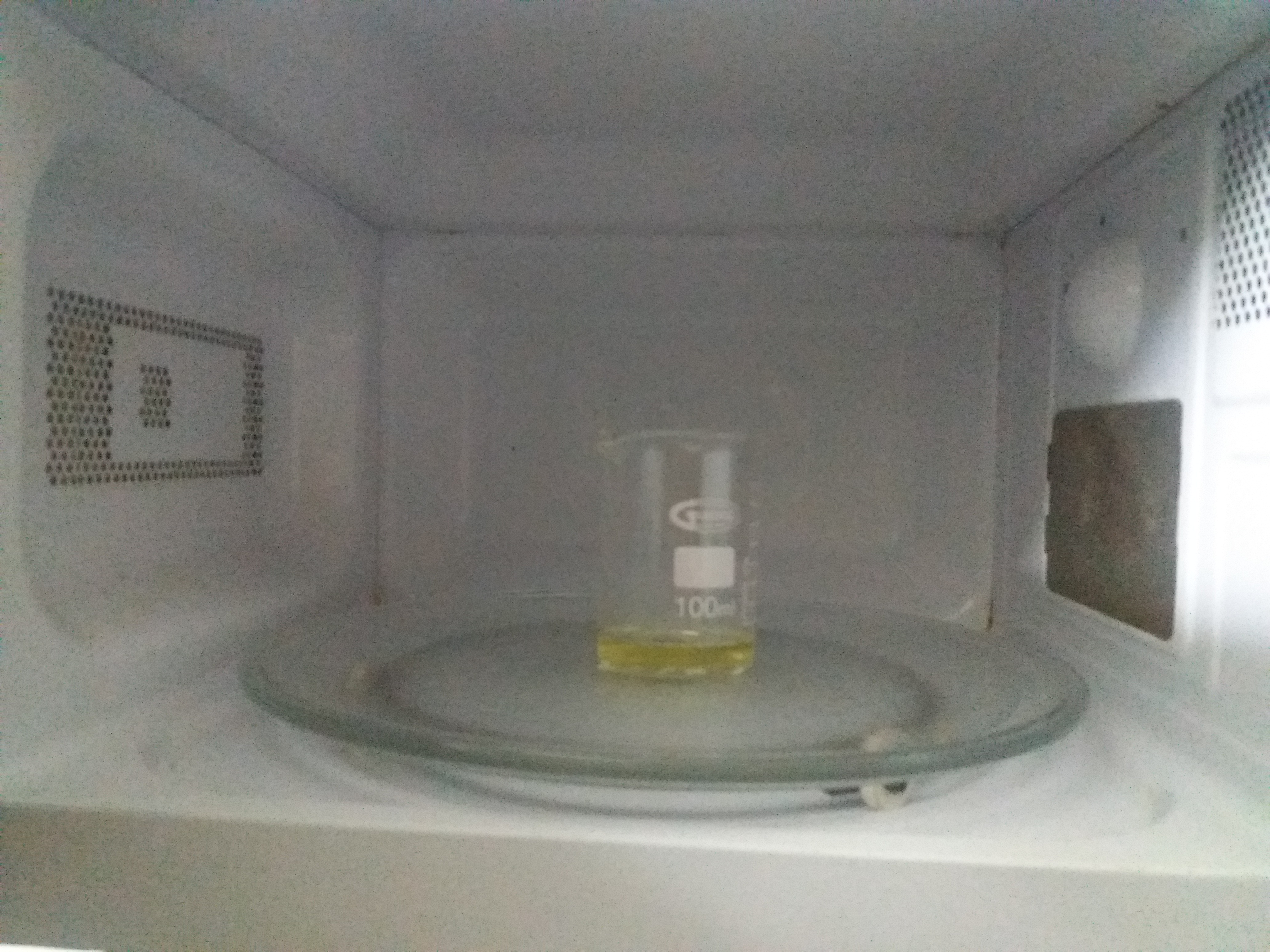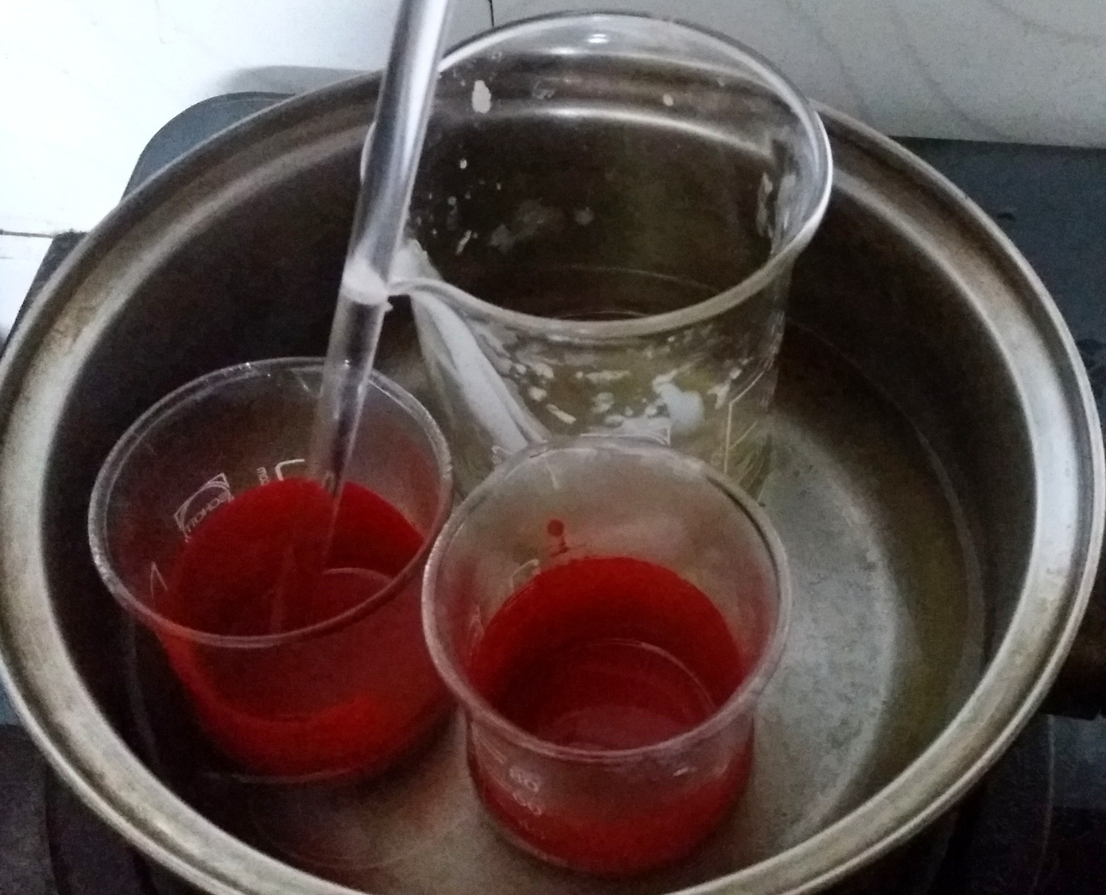 +Đun nước thật sôi, sau đó tắt bếp. Để cốc màu vào nồi nước, nhờ sức nóng của nước làm nóng hỗn hợp trong cốc.