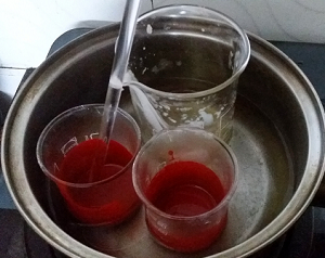 +Đun nước thật sôi, sau đó tắt bếp. Để cốc màu vàp nồi nước, nhờ sức nóng của nước làm nóng hỗn hợp trong cốc.