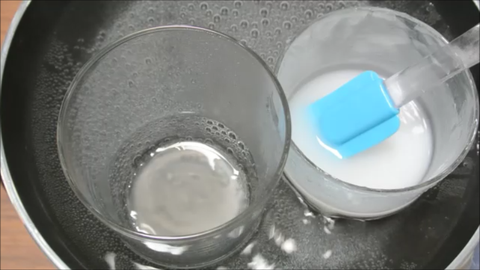 Cốc 2: Cân sáp đậu nành, cho lên bếp cho sáp tan chảy, thêm vào hỗn hợp cốc 1. Thêm hương liệu khuấy nhẹ (tránh tạo bọt).