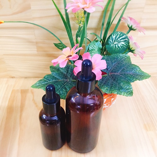 - Chai đựng mỹ phẩm bằng thủy tinh tối màu, nắp có ống nhỏ giọt.