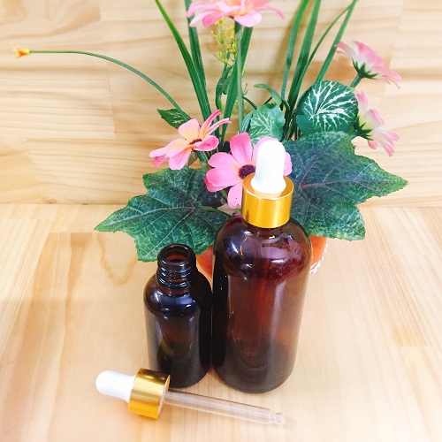 Chai đựng mỹ phẩm bằng thủy tinh tối màu, nắp có ống nhỏ giọt.