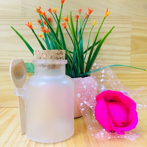 - Hũ đựng bột thiên nhiên bằng nhựa màu trắng sữa, nắp bần. phía bên có kèm muỗng gỗ.