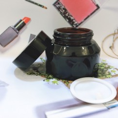 - Hũ đựng mỹ phẩm bằng thủy tinh tối màu, nắp nhựa bóng, phía trong có lớp lót trên hũ.