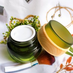 - Hũ đựng mỹ phẩm thủy tinh trong, nắp bọc gỗ tinh xảo.