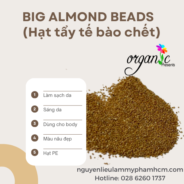 Hạt tẩy tế bào chết hạnh nhân sẽ giúp bạn luôn giữ được sự tươi mới rạng ngời của làn da mang đến sự trẻ trung, ngăn chặn mọi dấu hiệu của lão hóa như xỉn màu, thô sần, bít lỗ chân lông, mụn, nám... Hạt có kích thước 30/ 40 mesh ( tương đương 420 - 595 um) phù hợp để tẩy tế bào chết cho cơ thể.